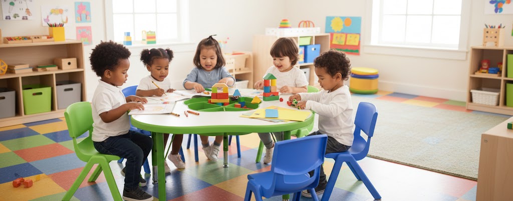 This set works especially well for preschool classrooms and childcare activity rooms where versatility, visual appeal, and easy upkeep are priorities.