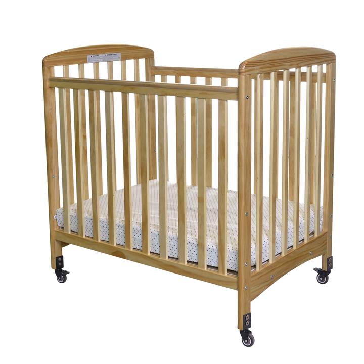- Compact child care crib with 4 slatted wood sides that still provide full protection and visibility for babies and infants in a daycare setting